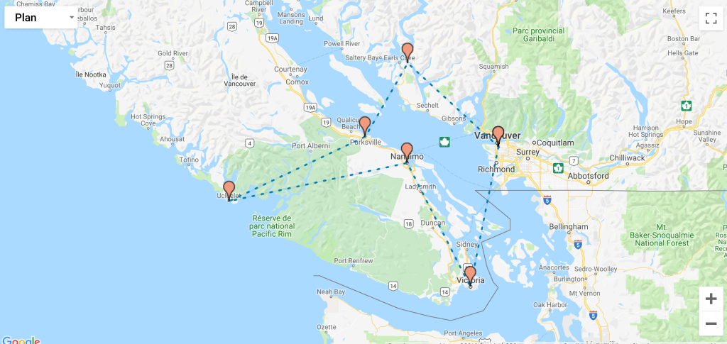 Route retour pour Vancouver en voiture et ferry, où l’on retrouve notre hôtel du centre. Restitution de la voiture de location, et dernière soirée à Vancouver.